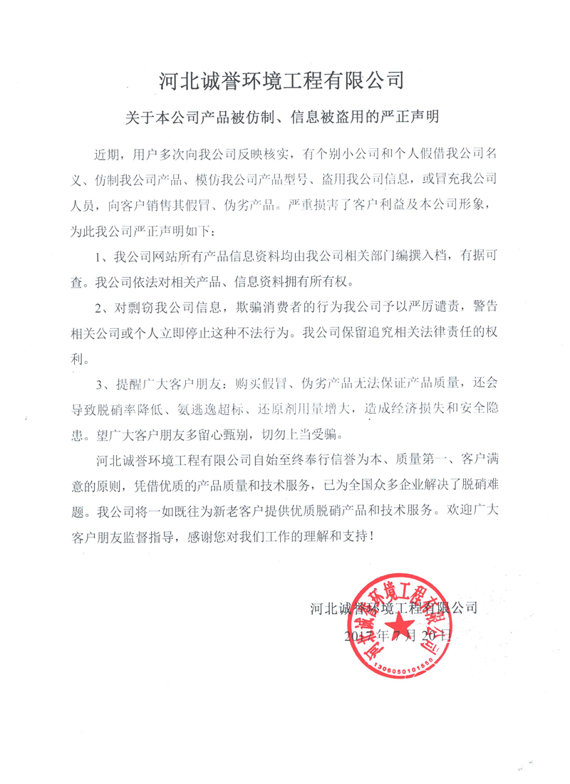 3、提醒廣大客戶朋友:購買假冒、偽劣產品無法保證產品質量,還會導致脫硝率降低、氨逃逸超標、還原劑用量增大,造成經濟損失和安全隱患。望廣大客戶朋友多留心甄別,切勿上當受騙。