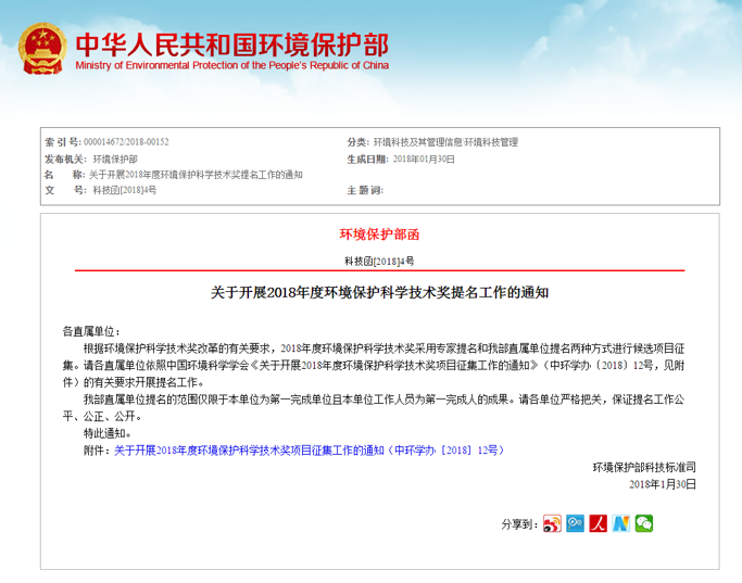 河北誠(chéng)譽(yù)環(huán)境工程有限公司獲悉,2018年度環(huán)境保護(hù)科學(xué)技術(shù)獎(jiǎng)項(xiàng)目征集工作正式啟動(dòng),網(wǎng)上申報(bào)截止日期為2018年5月31日17:00,書面材料報(bào)送截止日期為2018年6月15日(以郵寄日期為準(zhǔn))詳情如下: ..