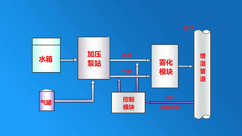 系統結構:該系統霧化噴槍固定在增濕塔錐體部位,整套設備由四部分構成:一是壓縮空氣供應系統,與主排風機相連接;二是加壓供水系統。由立式多級離心泵帶電機和整套精密低壓閥門、過濾器等附件組成;三是增濕塔頂部霧化系統。由增濕塔頂部環管、噴槍、噴嘴、高壓伸縮軟管及精密閥門、過濾器等連接件組成。四是多功能控制系統。由氣、水壓力、溫度、流量測控器,低壓元器件和變頻器等組成完整閉路控制系統。